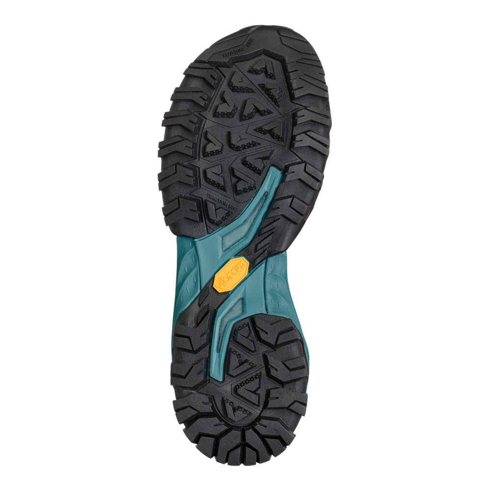 La suola Vibram® DUKE è dotata della tecnologia traction lug, una tassellatura specifica per terreni misti, sassi, ghiaia ed erba che consente di ottenere un maggior grip con il terreno. Sul puntale è presente una climbing zone, ideale per i tratti più impegnativi o di sentiero attrezzato, mentre il puntale in gomma e il prolungamento a baffo della suola proteggono il piede e aiutano nell’assorbimento degli urti.
